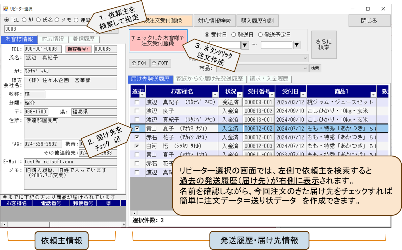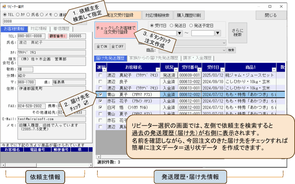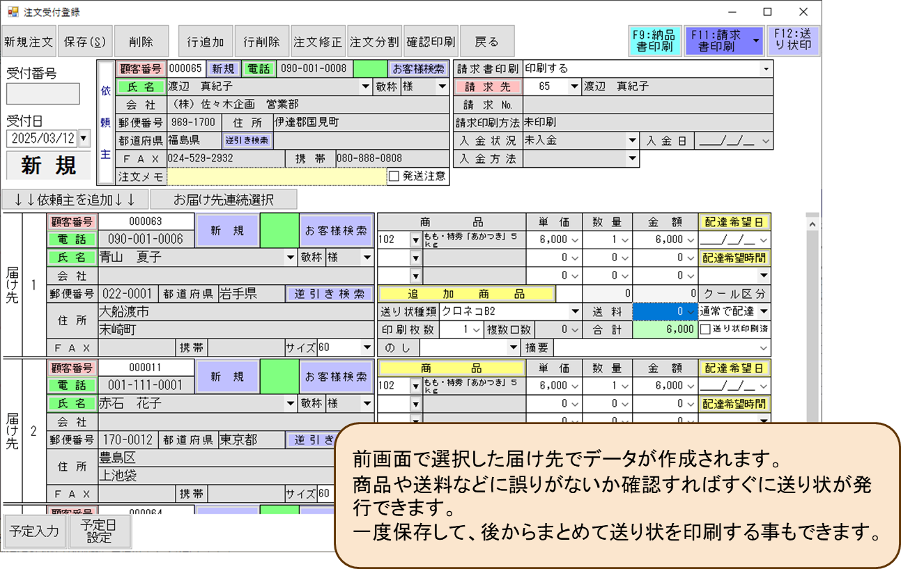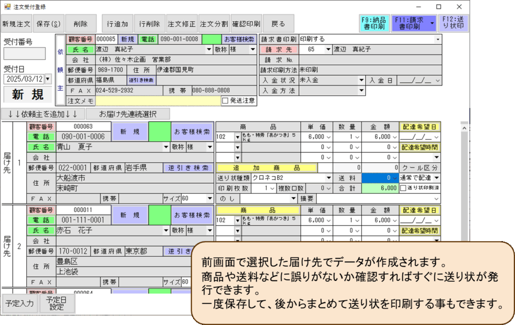 宅配管理プレミアムでは、電話番号や氏名で検索した顧客情報が即座に表示されます。表示された情報をもとに、以下のような活用が可能です。