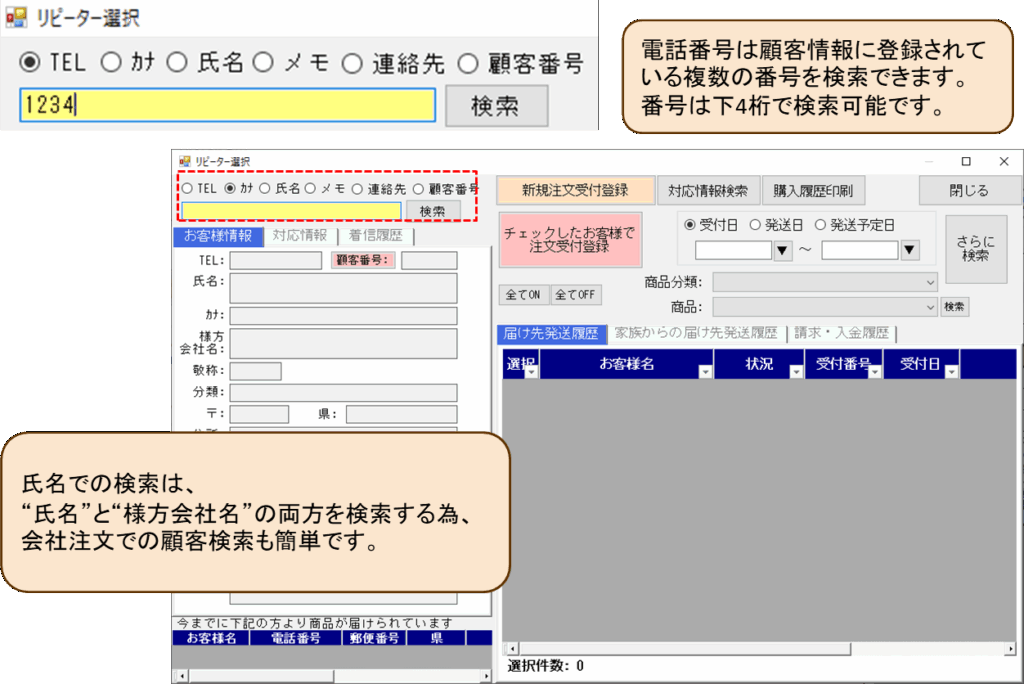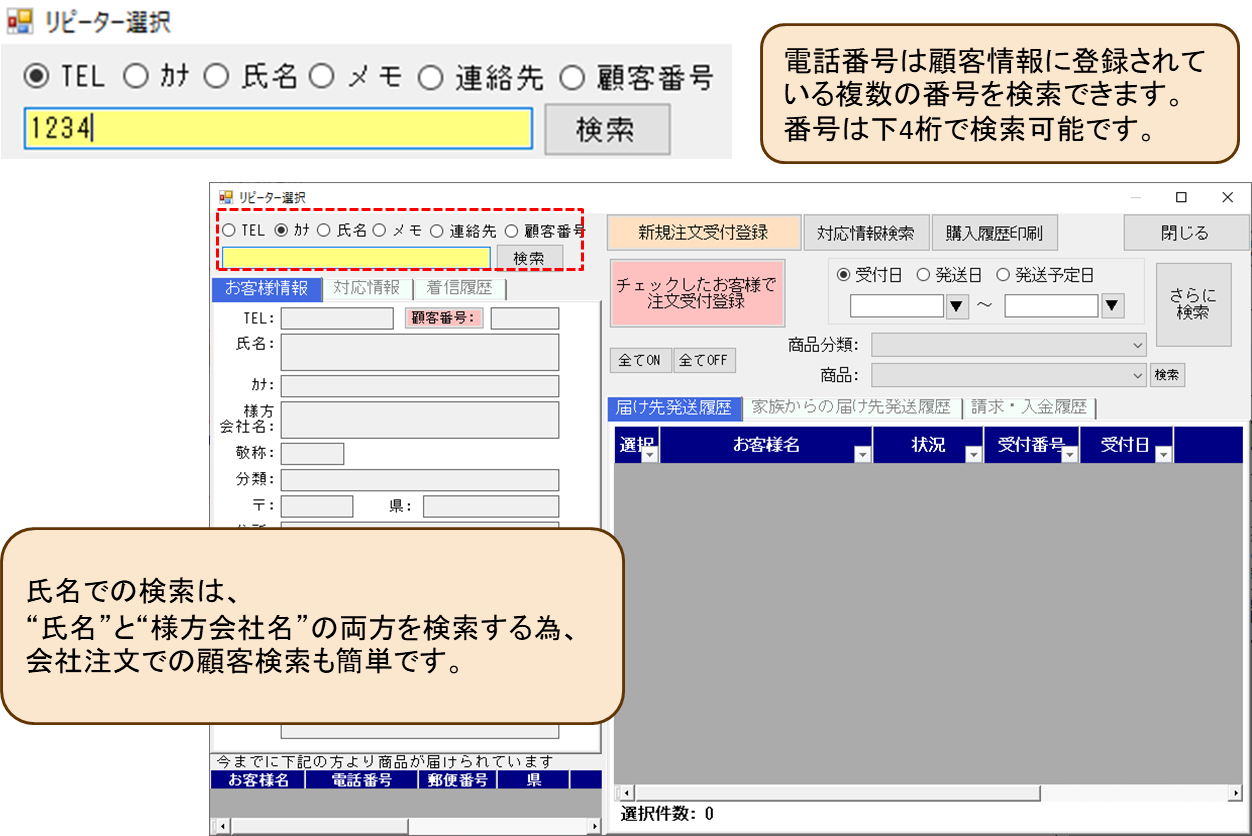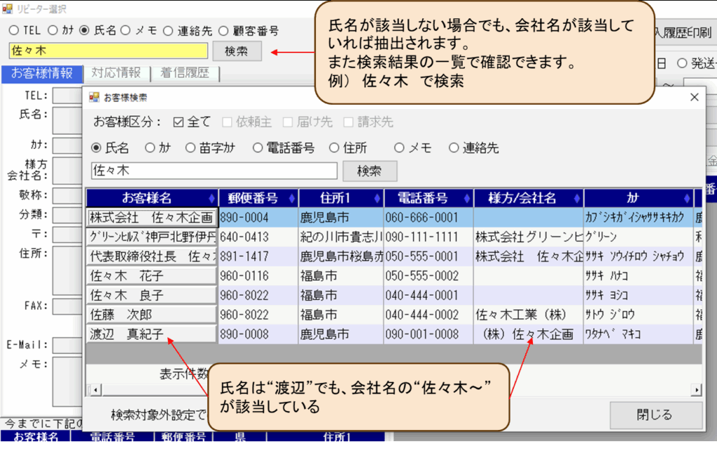 氏名での検索の場合は、1つの入力で会社名や氏名を検索します。性名のどちらかだけでも、該当のお客様を探し出すことが可能です。