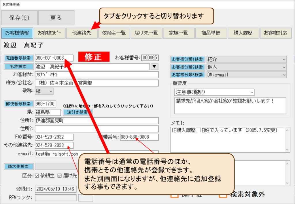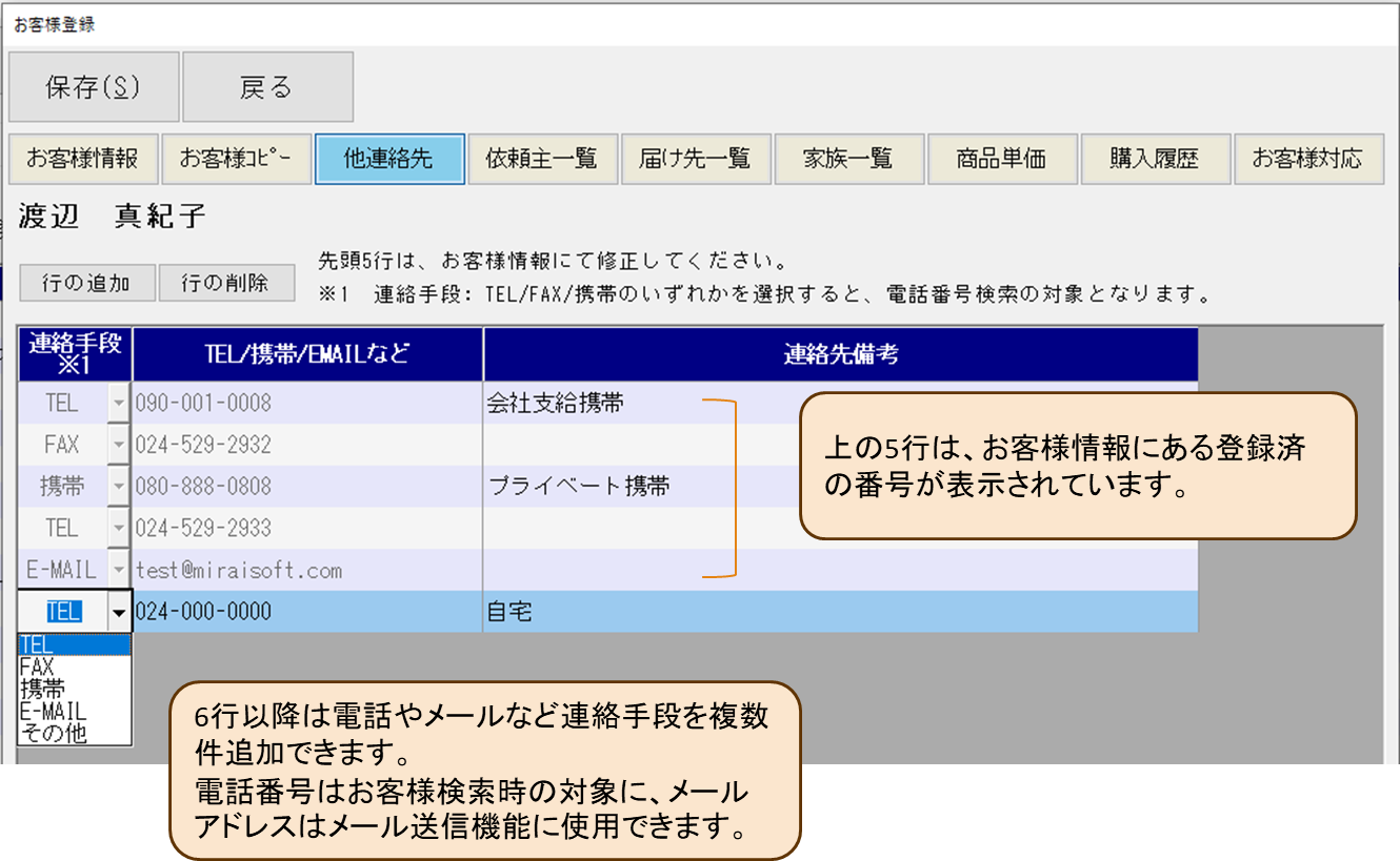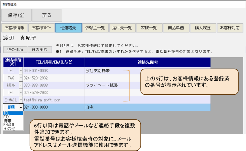 • 自宅・携帯・会社など、複数の番号を1顧客に紐づけて登録
